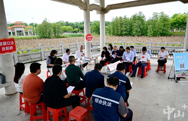 火炬高新区得能湖公园莲花议事亭开展《中山市住宅小区物业管理规定(草案)》意见征集活动。记者 余兆宇 摄